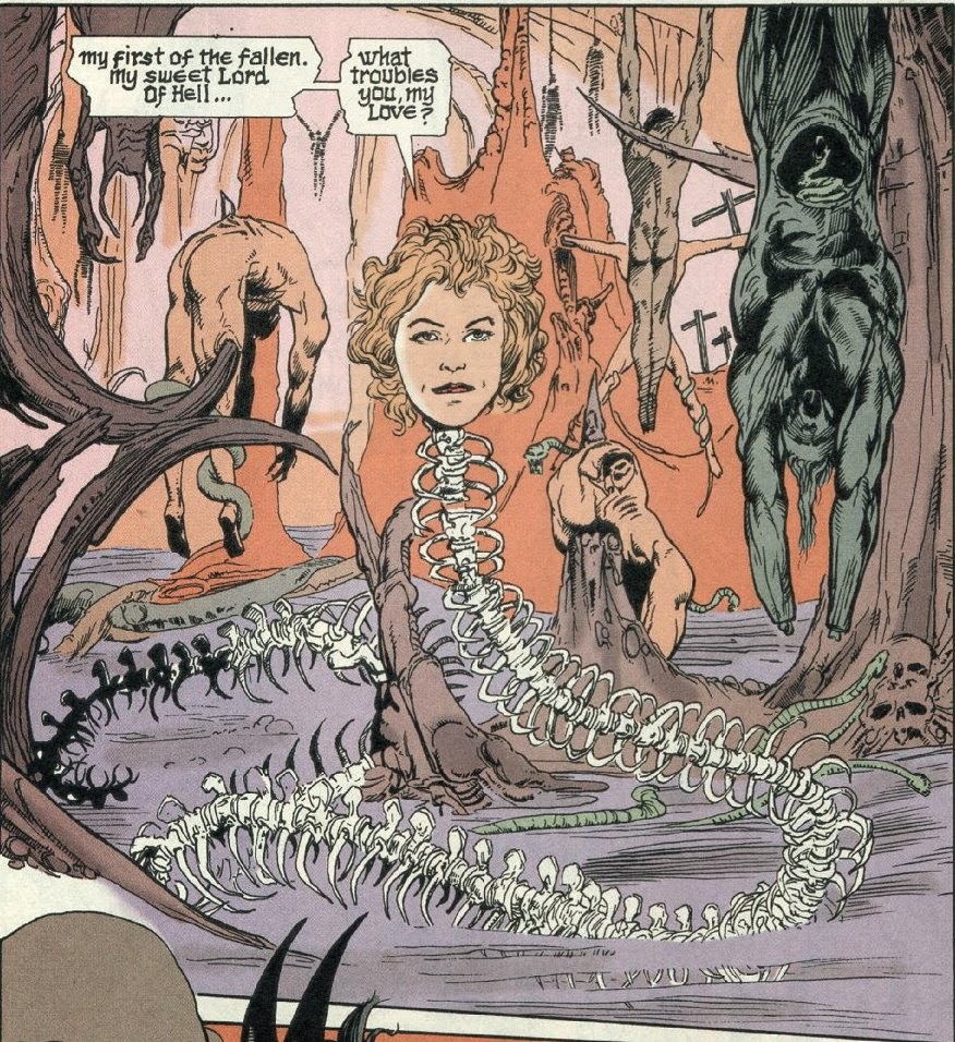 Desde la visión de Ennis este demonio es el verdadero Adversario, el primero de los Caídos, ya que cuando Lucifer cayó él ya estaba ahí abajo, esperando su momento. Así, con un solo movimiento, Garth Ennis consigue ubicar su visión del estado del Infierno mencionando no solo la famosa renuncia por parte de Lucifer, sino también la presencia de diferentes demonios como Etrigan. Particularmente me encanta el desdoblamiento, necesario para jugar con la maldad y los tonos grises que tan bien supo aportar el Lucifer de Neil Gaiman y la continuación escrita por Mike Carey.